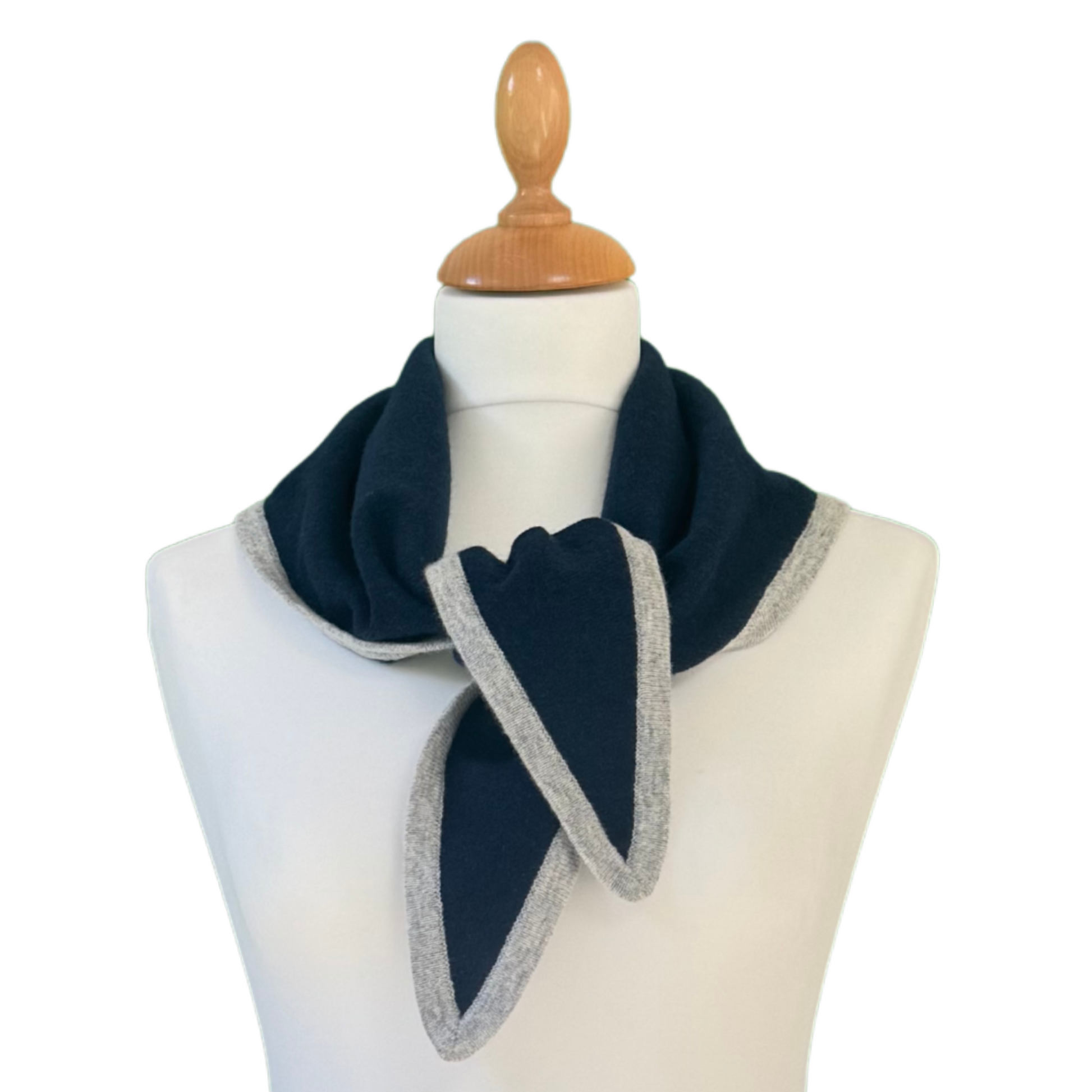 Elegant navy triangle scarf, framed with a soft, light-grey border for a refined contrast. Knitted from a luxurious cashmere-merino blend. Wonderfully soft, lightweight and versatile.